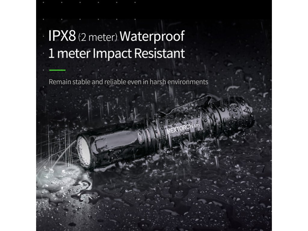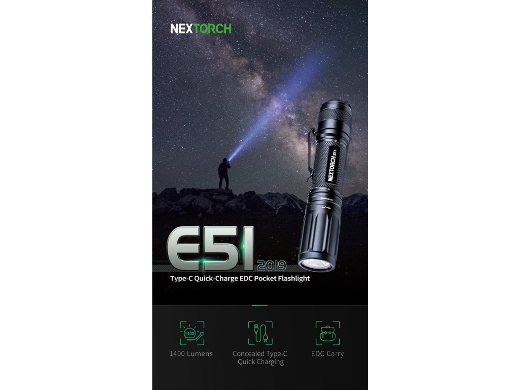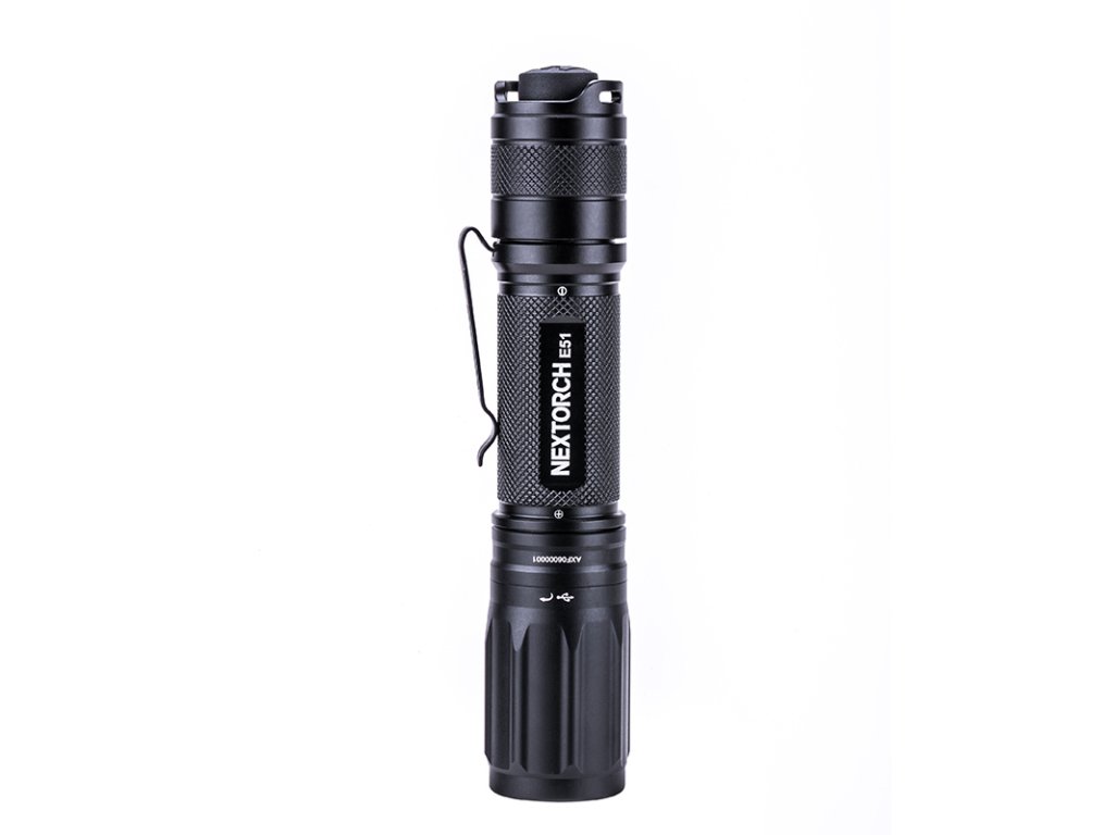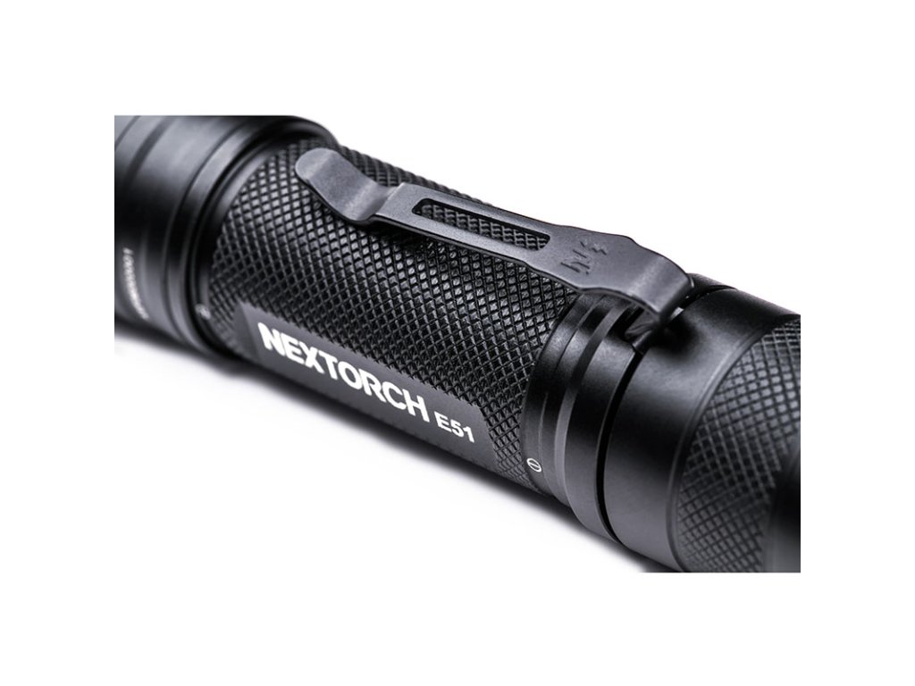 Svítilna od značky Nextorch. Nový upgradovaný model svitilny E51, je nejnovějším modelem s maximálním výkonem o síle 1400 lumenů, kterou lze použít jak v noci tak i ve dne. Čočky svítilny jsou z tvrzeného skla pro lepší tepelnou odolnost a propustnost světla. Na výběr je z 5 světelných režimů, které splňují různé požadavky a potřeby osvětlení od krátkého až po vysoce silný a daleko dosahující světelný paprsek. Je vybavena klipem pro přinutí svítilny za opasek či do kapsy kalhot a také odnímatelným ručním provázkem pro zavěšení svítilny.